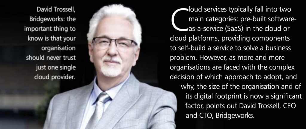 Cloud services typically fall into two main categories: pre-built software-as-a-service (SaaS) in the cloud or cloud platforms, providing components to self-build a service to solve a business problem. However, as more and more organisations are faced with the complex decision of which approach to adopt, and why, the size of the organisation and of its digital footprint is now a significant factor, points out David Trossell, CEO and CTO, Bridgeworks.